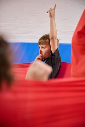Karin Budde und Michaela Büschler haben ein großes elastisches Tuch mitgebracht, ein Rondotuch. Alle stellen sich in einen Kreis. Das Tuch umhüllt sie und die Kinder lassen sich hineinfallen. Sie können sich ohne festzuhalten gegen das Tuch lehnen. Nun heißt es Abschiednehmen. Ein Kind tritt in die Mitte. Das Tuch verliert an Spannung und fällt herunter. Matilda (6 Jahre) erklärt: „Wenn ein Kind aus dem Tuch weggegangen ist, konnte ich nicht mehr gut auf den Füßen stehen. Dann bin ich ausgerutscht.“ Und Fritz (5 Jahre) sagt: „Ja, dann war es wackelig.“